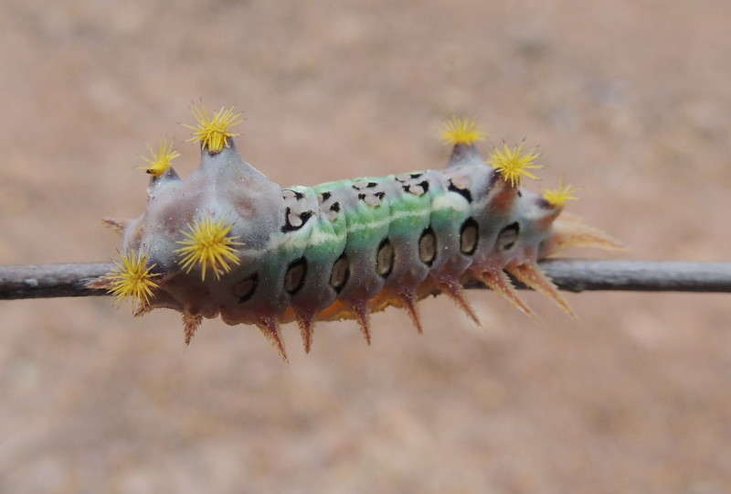 For protection the caterpillar can deploy spines, that in some species are loaded with irritant liquid. The spines are kept in pockets on the front and back of the caterpillar. The larva pictured above, has eight such pockets, four at the front and four at the back each containing yellow spines. In the picture the spines at the back are partially everted – only mildly annoyed! When very annoyed the caterpillar can erect all eight spine clusters from their pockets (picture left).