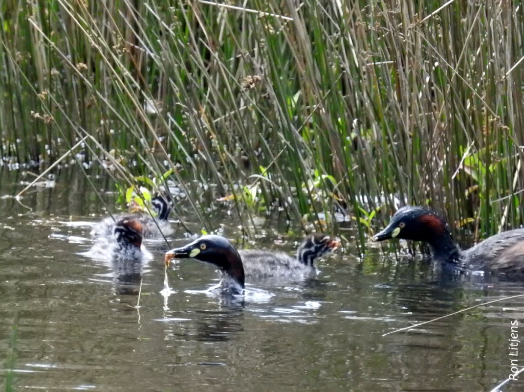 This form of chick transportation only takes place in the first few weeks after hatching. By then the greeblies are too big to fit on their parents’ backs and have themselves learned the art of diving when danger approaches. Daily life now appears to consist of the adults diving down and picking up food that is voraciously eaten by the chicks as soon as they surface.