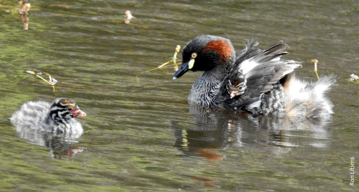 After three anxious weeks of watching them on the nest – a floating structure built way to close to the shore by my way of thinking and in the vicinity of a big ol’ Red-bellied Black (Snake), mum and dad Australasian Grebes (Tachybaptus novaehollandiae) hatched what can only be described a three cotton balls with paddles.