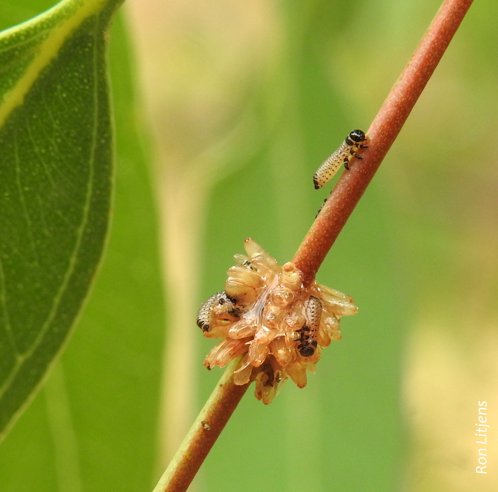 The photograph above shows that out of one such cluster small grubs emerged and then made their way along the stem to the nearest leaf where they joined their ‘hatching cohort’ devouring gum leaves. These are the larvae of Eucalyptus Leaf Beetles, beetles that sort of look like Ladybird Beetles but are bigger (click HERE for related blog).