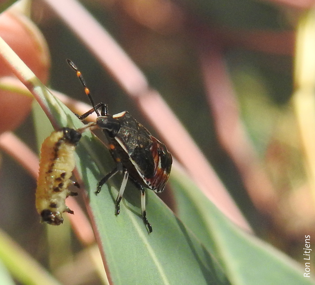 The life of the grub however is not easy. There are all sorts of perils along the way. Pictured right is a predatory Shield Bug nymph attacking a beetle grub. It stabs the grub with its rostrum through which it pumps in digestive juices and then sucks out the nutrients.