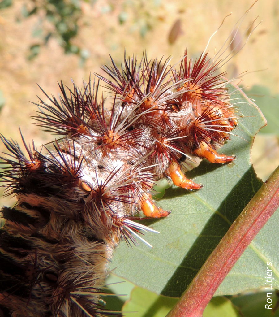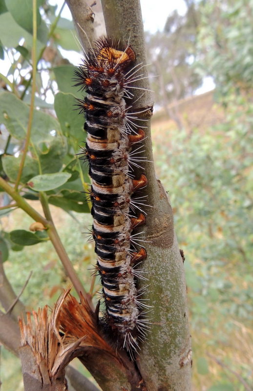 But it is the caterpillar that is fascinating. The caterpillar of the White-stemmed Gum Moth (pictured right) is one of the largest in Australia, up to 12cm long. It feeds on the leaves of various eucalypts and paperbarks. The body is covered in very sharp dark red barbed spines (pictured below) that are strong enough to pierce human skin. When touched they break off and embed themselves in the skin causing pain and localized swelling. The spines are difficult to remove.