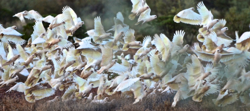 There is a massive flock of Long-billed Corellas (Cacatua tenuirostris) which roosts at the Yea Wetlands. They turn up towards dusk and the noise is deafening. A friend who had seen a similar flock thought they must nest in vast colonies somewhere, but I was able to point out that flocking is an Autumn-Winter thing. Mating pairs reunite and disperse in Springtime – they are monogamous and mate for life. Then in Summer the parents with their squeaking, demanding young ones hang around in family groups. The whole flock does not breed each year; I think I read that only about 80% breed each year, otherwise there would not be enough nest holes in trees.