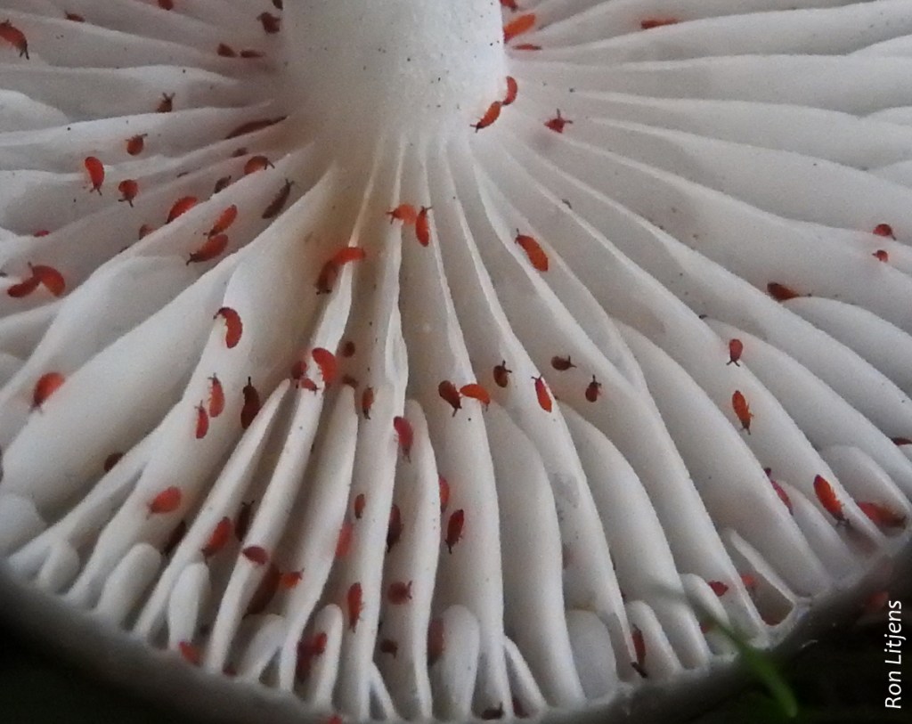 There are many different types of Springtails. Last week I came across the broken top of a white-gilled mushroom lying upside down on the ground. After picking it up a rush of red springtails emerged from the gills (pictured above). These are springtails of the order Poduromorpha characterised by an oval shaped plump body, short legs and two noticeable antennae. Red Springtails feed on the spores of fungi. If you look careful at the gills of most mushrooms you will find springtails though not all of them will be red.