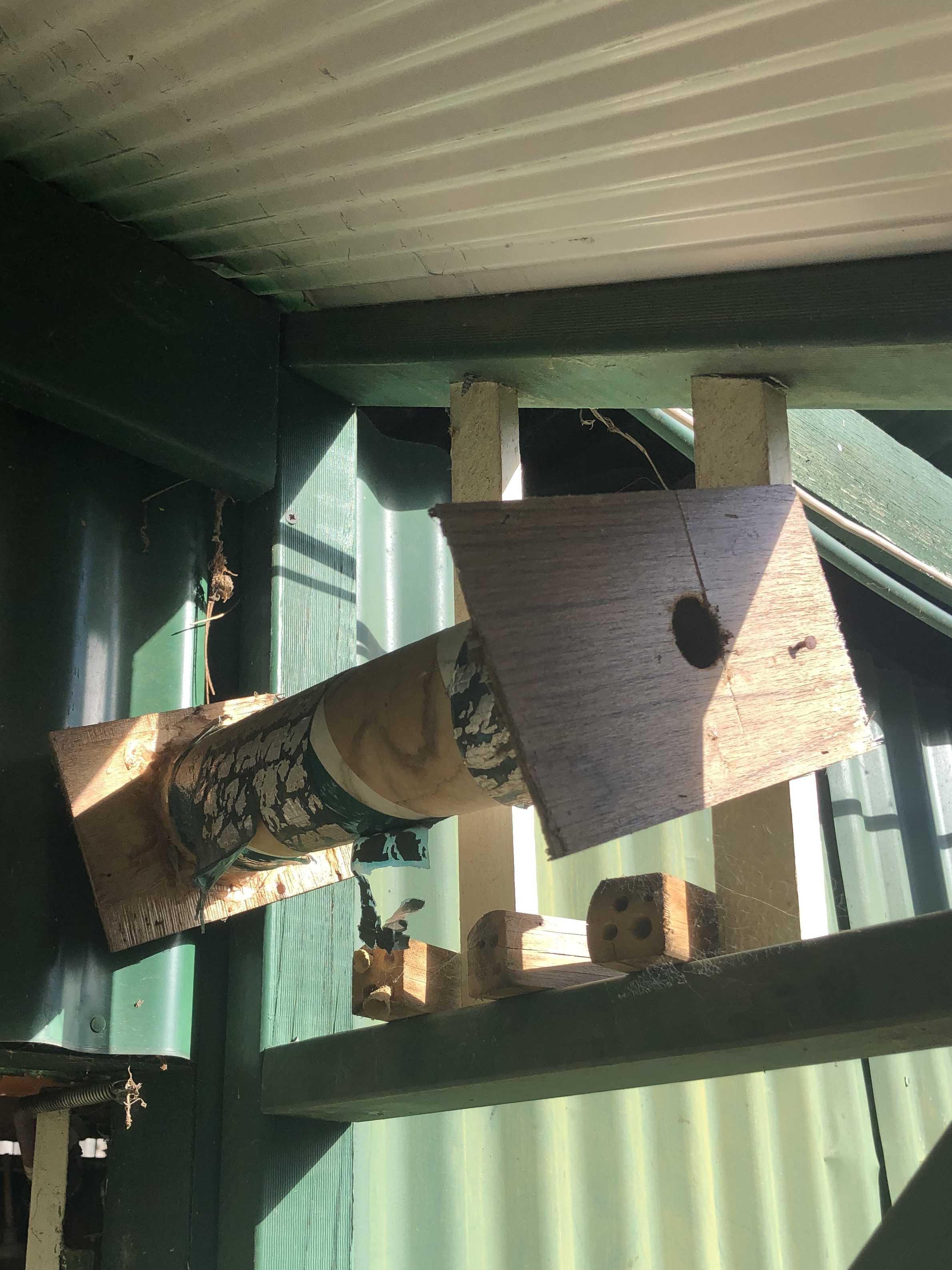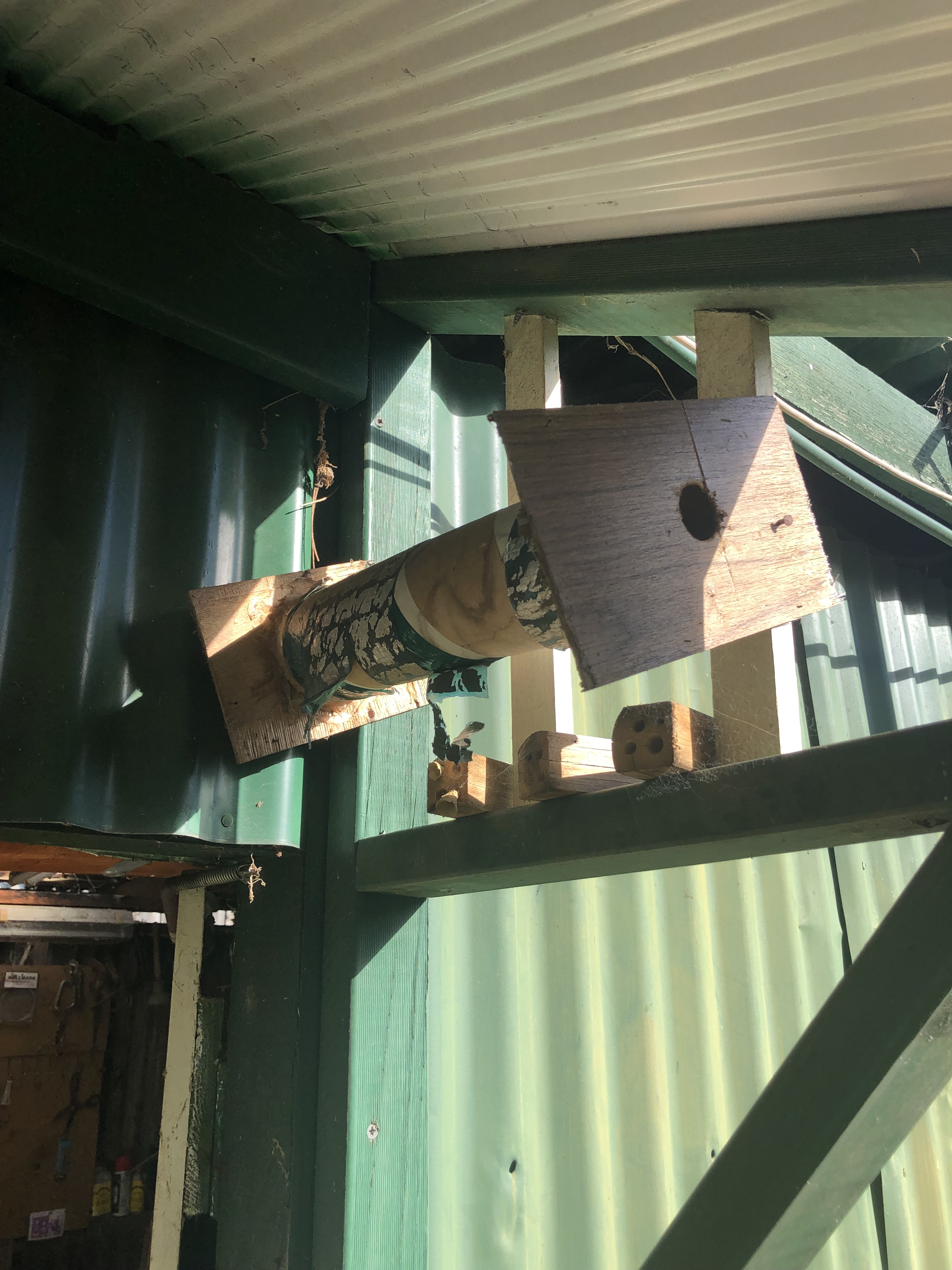 A cardboard tube with a piece of ply glued to each end, and a 25mm hole drilled in the front one – small enough to keep out sparrows. Works perfectly for Striated Pardalotes – sometimes. I have yet to meet the right tenant for this one.