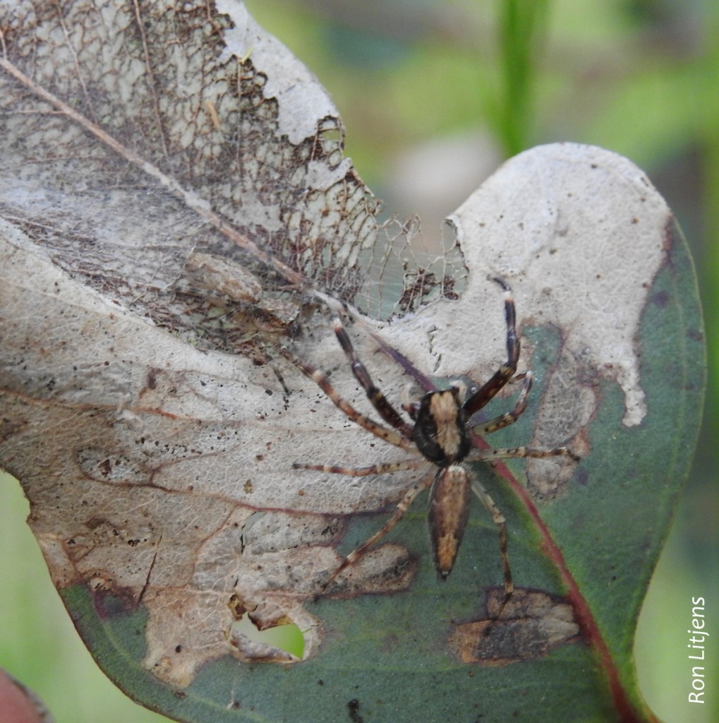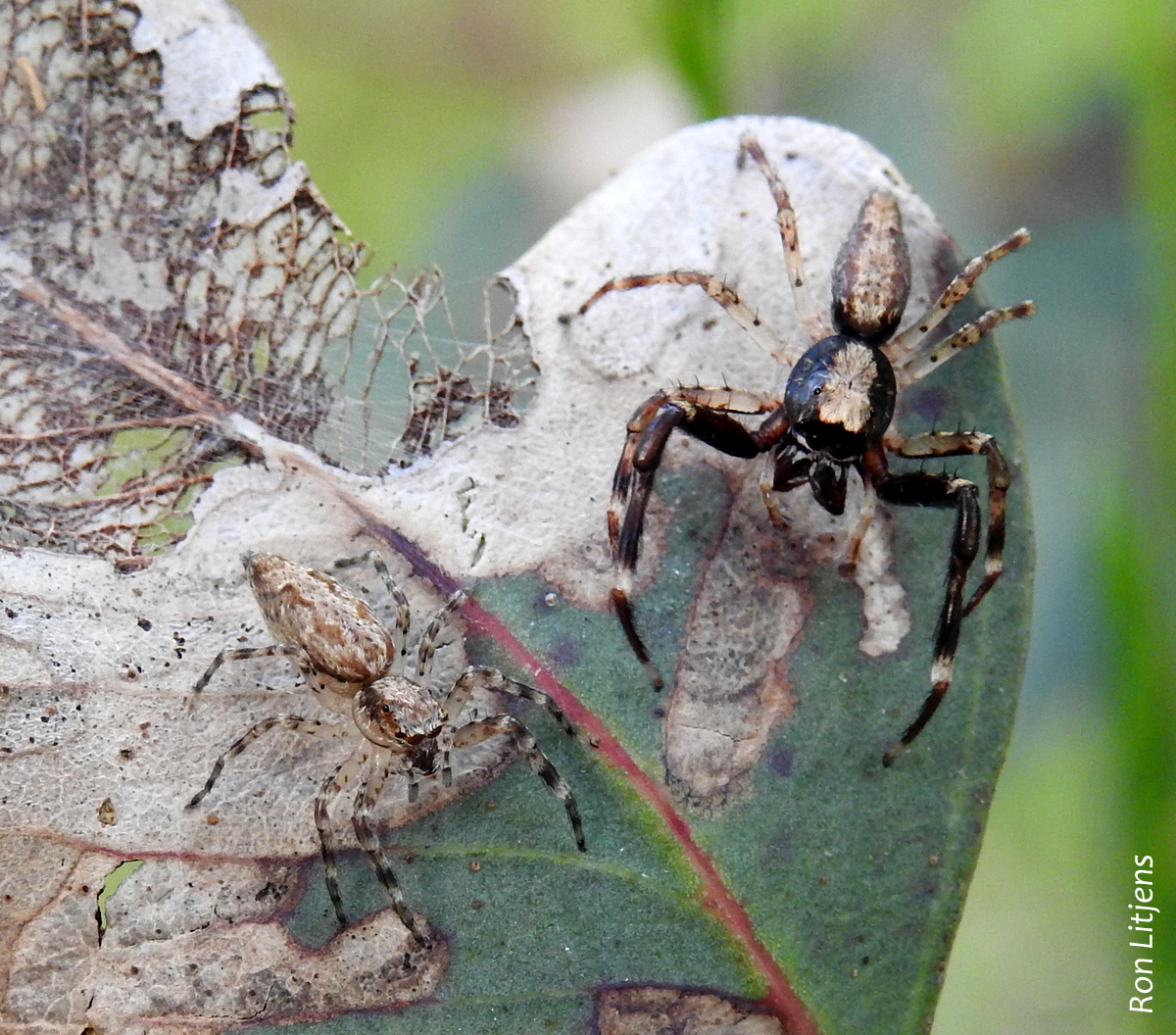 I was fortunate enough this week to witness such a display between two Threatening Jumping Spiders (Helpis minitabanda). Pictured above is the male spider (right) tapping on the web that the female was sitting under. It took a number of minutes before the female spider came out. What followed was a series of ‘body-taps’ where the male moved in, tapped and then quickly retreated (pictured right) to assess the reaction to his advances. Unfortunately both spiders got annoyed with my watching and jumped away, hopefully to mate in privacy.