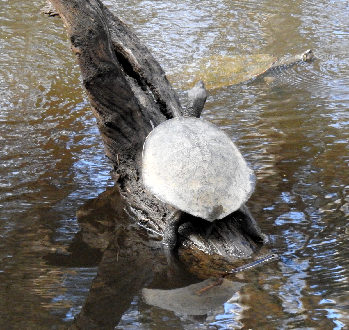 Long-necked turtles can be found in slow moving or still water bodies. A quick trip along the Goulburn River at the moment where a many billabongs have be filled by the recent flooding will reveal many turtles either floating on the surface or sunning themselves on nearby logs (see photo below).