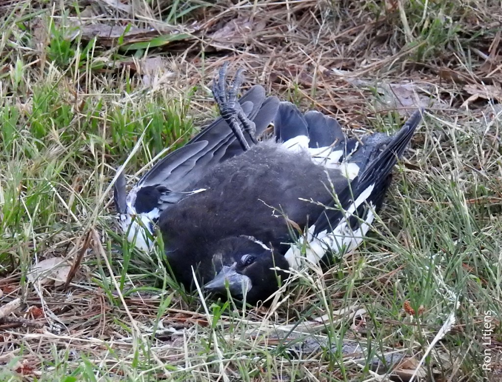 I was sitting outside watching the landscape change colour during ‘golden light’ time when I heard a loud squawk and an Australian Magpie (Gymnorhina tibicen) fell out of a nearby tree and landed on its back. It gave three feeble flaps of its wings and then died on the spot. Scanning the branches there was no sign of a snake, goanna or other reason for its demise.