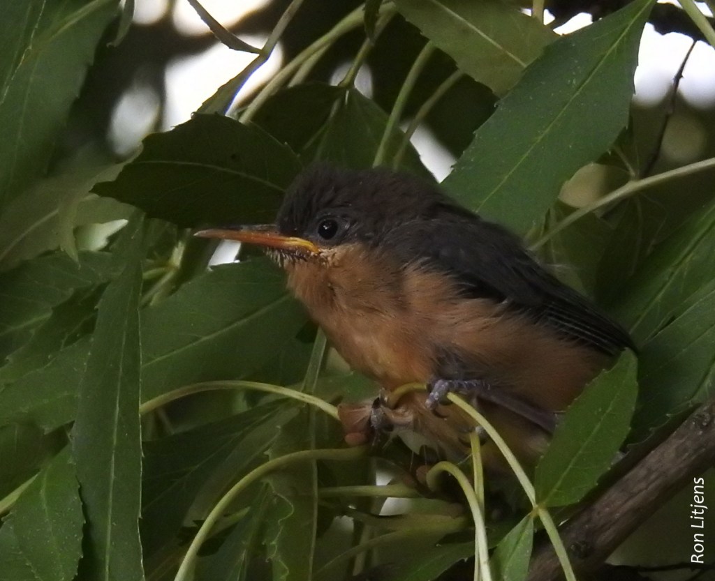 This week two fledglings tried their luck at taking flight. Chick 1 (pictured left) displayed more ‘plummet’ than flight and with a furious flap of wings crash landed in the middle of the driveway. Chick 2 flew a bit further. Their incessant chirping combined with encouraging vocals from the nearby parents attracted the attention of the dog and the chickens who raced over for a look. To rescue them I placed both birds back in the nest but chick 2 launched itself in flight again with the same results. It was placed in the nearby tree (pictured below) out of harm’s way. For the rest of the afternoon I left them to it. Chick 2 I observed undertook little flights from branch to branch with the parents hovering nearby.