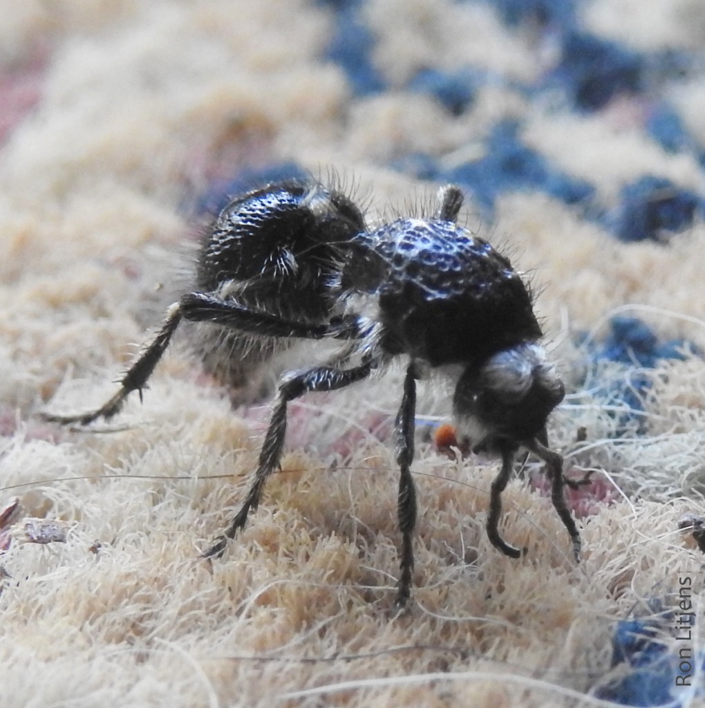 Whilst sitting down for a coffee I noticed that a hairy insect (pictured) had wandered in from outside and across the carpet. Close examination showed that it was wingless and extremely hairy. It is because of the hair that this insect is known as a Velvet Ant (Bothriomutilla rugicollis). Velvet ant is the generic term for wasps of the family Mutillidae. As mentioned they are hairy, the male is winged and the female is wingless.