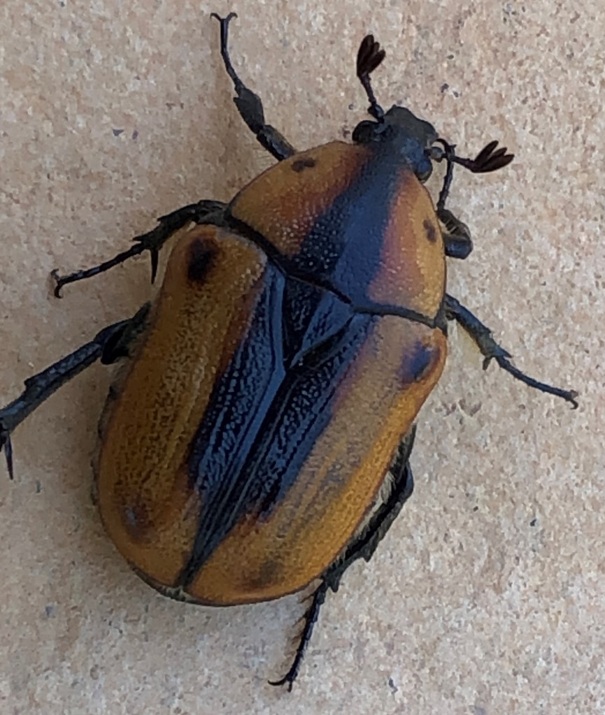 Terry H has recently come across another scarab – the rather large Cowboy Beetle (Chondropyga dorsalis). This one has fan antennae that it uses to detect odours, and female beetles during mating season. The Cowboy Beetle is not considered dangerous or even a pest. Like most scarabs the adults are nectar feeders and the young feed on decaying wood.