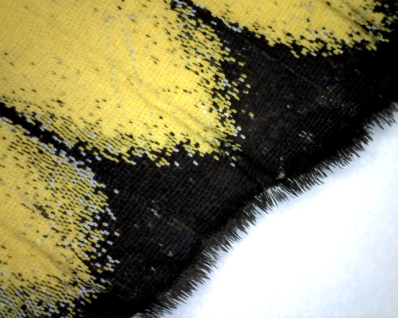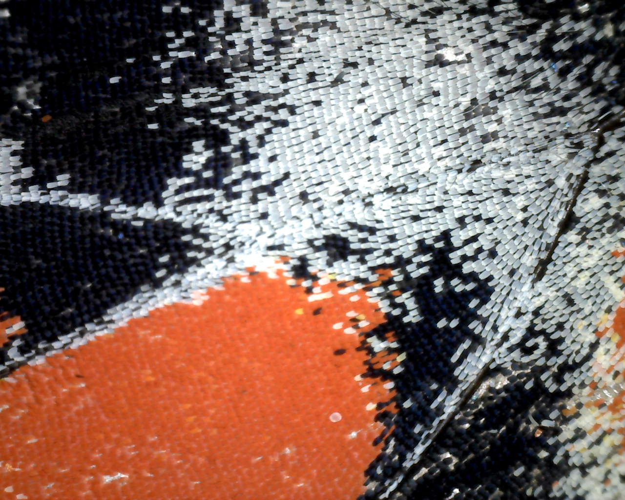 As with all butterflies and moths the wings are flattened membranous sacs covered in scales (pictured right). The scales provide the butterfly with both protection against the elements and thermal regulation. Scales are attached to individual slots on the wing in overlapping transverse rows and are easily detached, particularly useful if caught in a spider’s web! Marginal scales on the wing edges are longer and form a fringing effect (pictured below left). In addition the male butterflies have sex scales that are associated with pheromone producing glands.