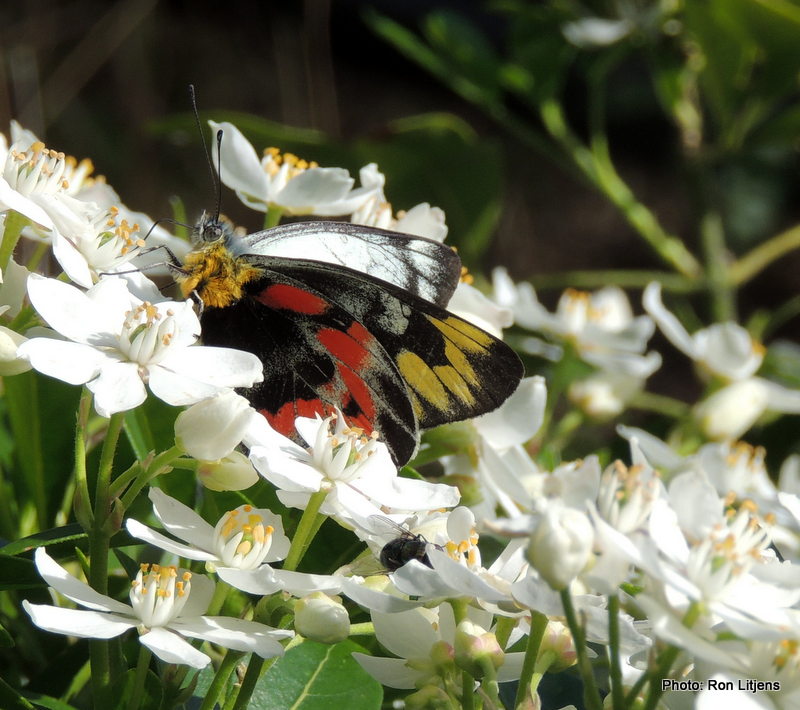 The Imperial Jezebel (pictured left) is one of the more colourful butterflies in the district and is endemic to Australia being distributed along the coast and ranges of NSW and Victoria. The eggs are laid on mistletoe plants with cocoons being formed in early autumn and the adults emerging in the spring.