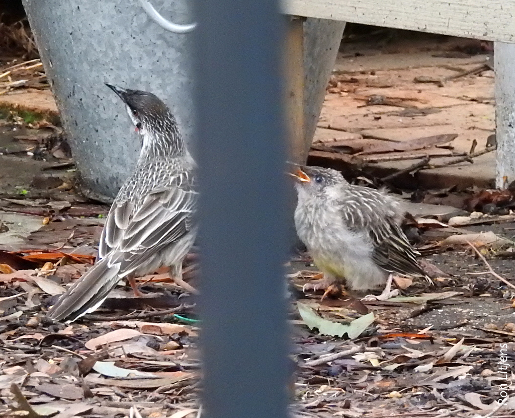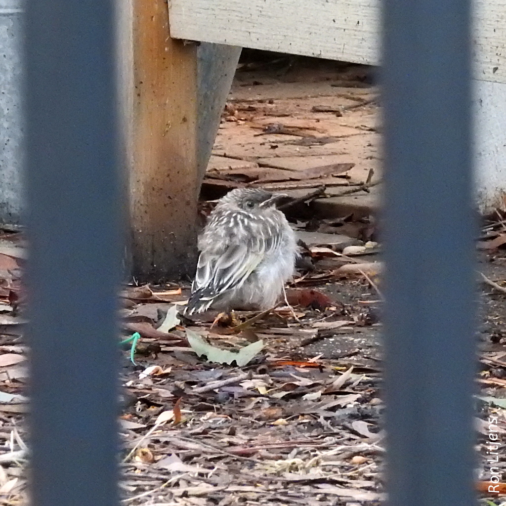 On Grand Final day I came across a Red Wattlebird (Anthochaera carunculata) chick, pictured left, sitting on the ground loudly chirping with two equally loud adults sitting above in the tree. The chick was in a fenced-off yard containing a single large eucalypt and a few bushes. No nest was in sight and the bolshie chick was not going to let anyone put it in the bushes. So I let it be.