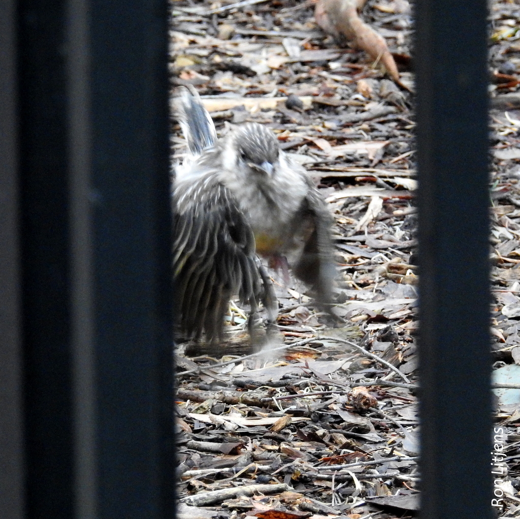 Five days later I walked past the same yard and observed a parent (pictured above right) still feeding the much larger chick on the ground. I was pleasantly surprised to see the parents had stayed around to feed the chick and that a cat had not made a meal of it. On observing me the chick made a pretty good attempt at a take-off (pictured left).