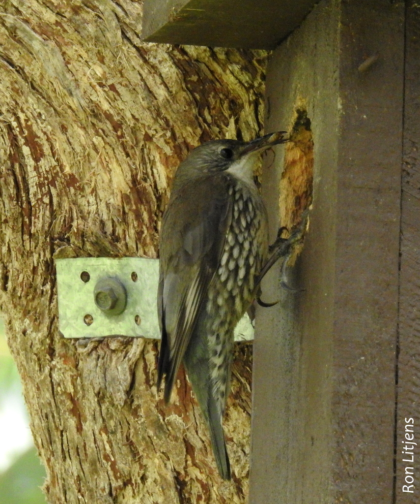 A pair of White-throated Treecreepers (Cormobates leucophaea) has taken up residence in a local nest box. They are a small bird distributed along the east coast of Australia from Cooktown around to Adelaide. Treecreepers are insectivorous and often seen climbing up the trunks of trees looking for insects, mainly ants. At the moment the adults are busy feeding the young. Every one and a half to two minutes the parents leave the nest box only to return to the box bringing food (pictured left).