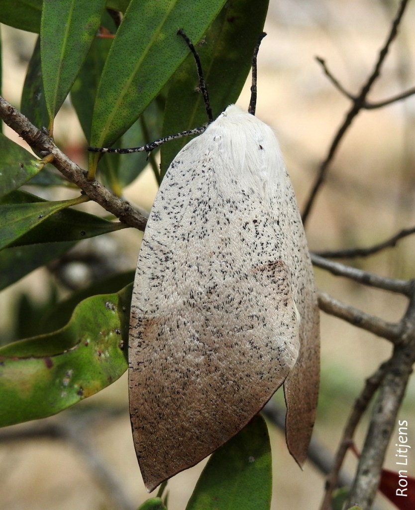The Fallen Bark Looper Moth (Gastrophora henricaria) is a moth named for the looping motion its caterpillar makes whilst walking. The caterpillar feeds on eucalypts and Brush Box (Lophostemon confertus). Being of the Geometridae family the caterpillar has three pairs true legs near the head and only two pairs of pro-legs at the other end.