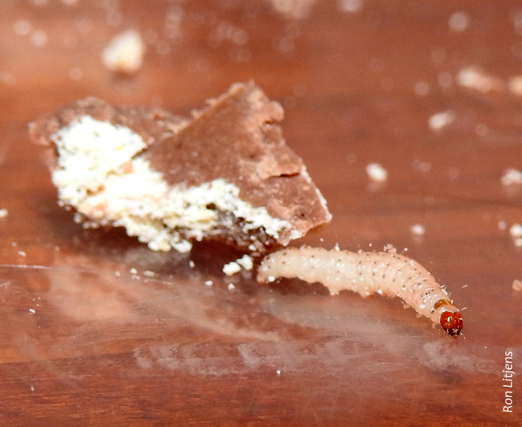 I noticed when unwrapping the foil of one that the confection had a hole in the top of the chocolate (pictured left) and that the hole appeared to contain a web. After carefully paring back layers of the sweet with a razor blade I came across a burrow in the peanut filling that contained a caterpillar, pictured below right. It emerged soon afterwards appearing none to please by the intrusion, pictured below left. Examination of the rest of the packet revealed that about 10% of the chocs had been similarly infested.
