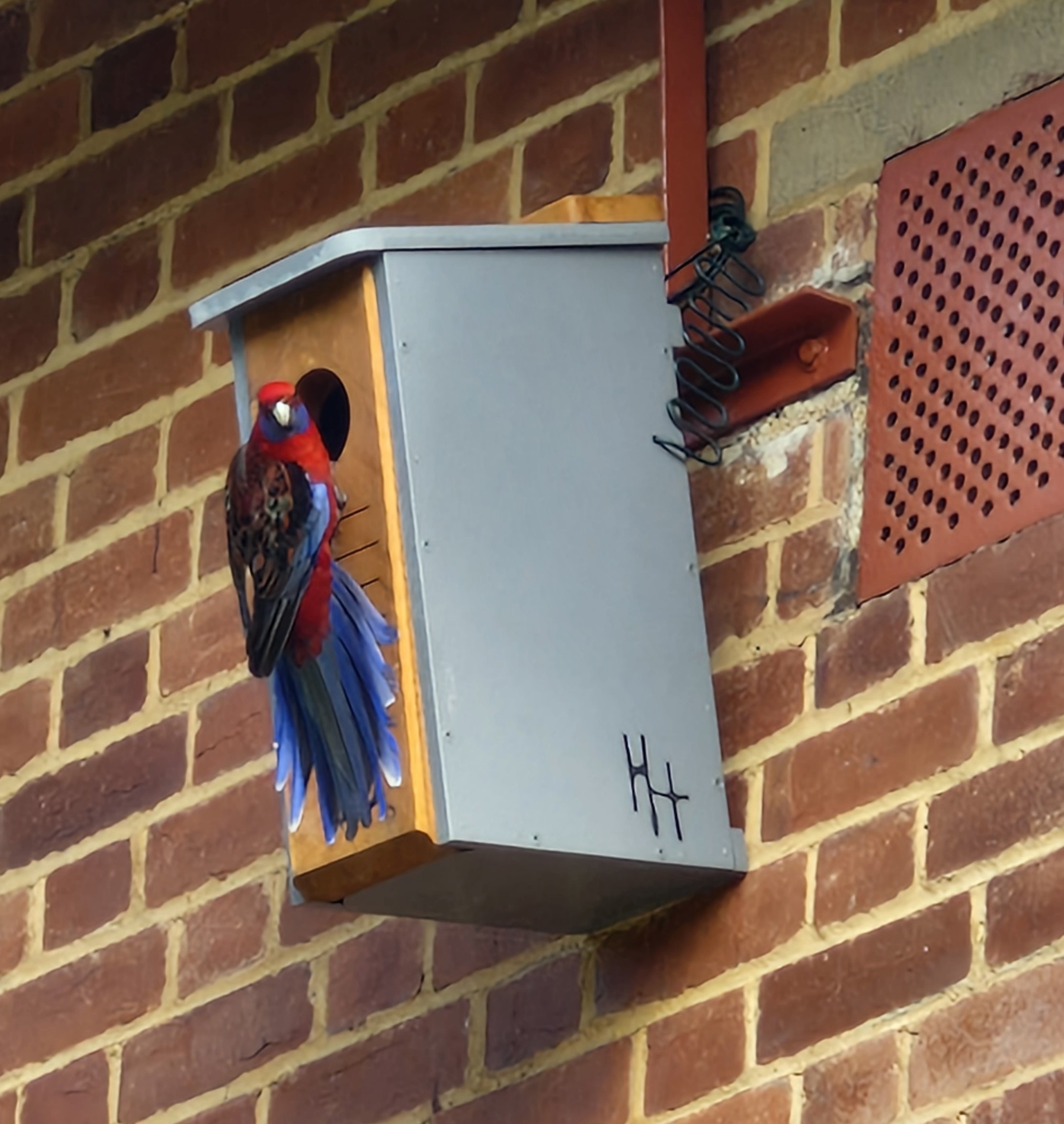 In autumn I installed nest boxes from the Yea River Landcare project and today I observed the first visit (that I know of) of a prospective tenant to one of those boxes (pictured above). Crimson Rosellas (Platycercus elegans) breed between September and January producing 5 – 8 white rounded eggs. They nest in tree hollows and cavities in buildings. The reason the nest box has been placed 7 metres up on the side of my building is to encourage them not the nest in the roof space, again!