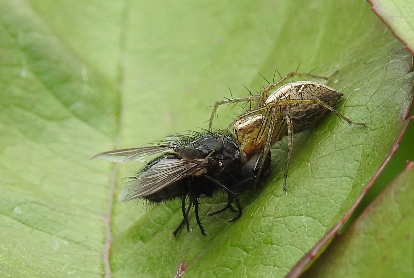 Lynx Spiders, picture above right, on the other hand catch their prey by running it down. The front legs are bristly so as to confine any prey that is captured and prevent the thrashing victim from damaging the spider’s eyes.