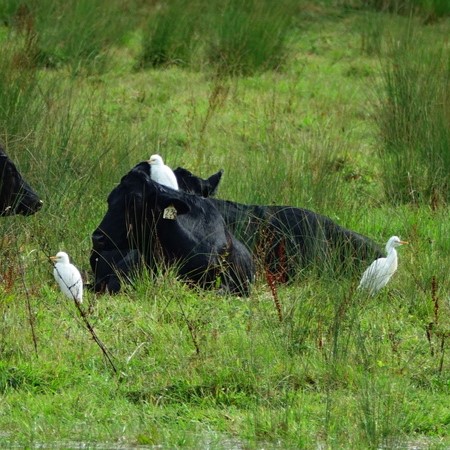 As the name implies, cattle egrets like to hang around cattle. You see them in the paddocks in conjunction with flocks of domestic cattle where it feeds on small invertebrates, worms, frogs and lizards stirred up by the feet of the moving cattle. It is also not unusual to see the bird on the backs of cattle taking ticks and flies from the hide.