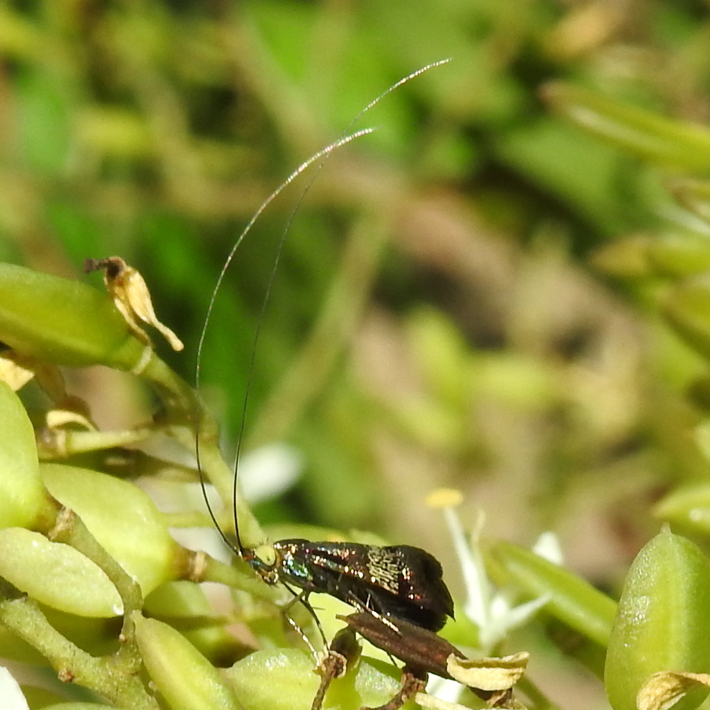 Sweet Bursaria (Bursaria spinosa) is shrub of the Pittosporaceae family with profuse white flowers. It is my insect-attracting plant of choice at the moment. Above a local grove of Bursaria there was a shimmering of tiny creatures moving so quickly it was difficult to tell what kind of creatures they might be. It was not until one of them settled of a flower that I could see it was a tiny moth – a Fairy Moth (Nemophora sparsella) to be exact (pictured below).