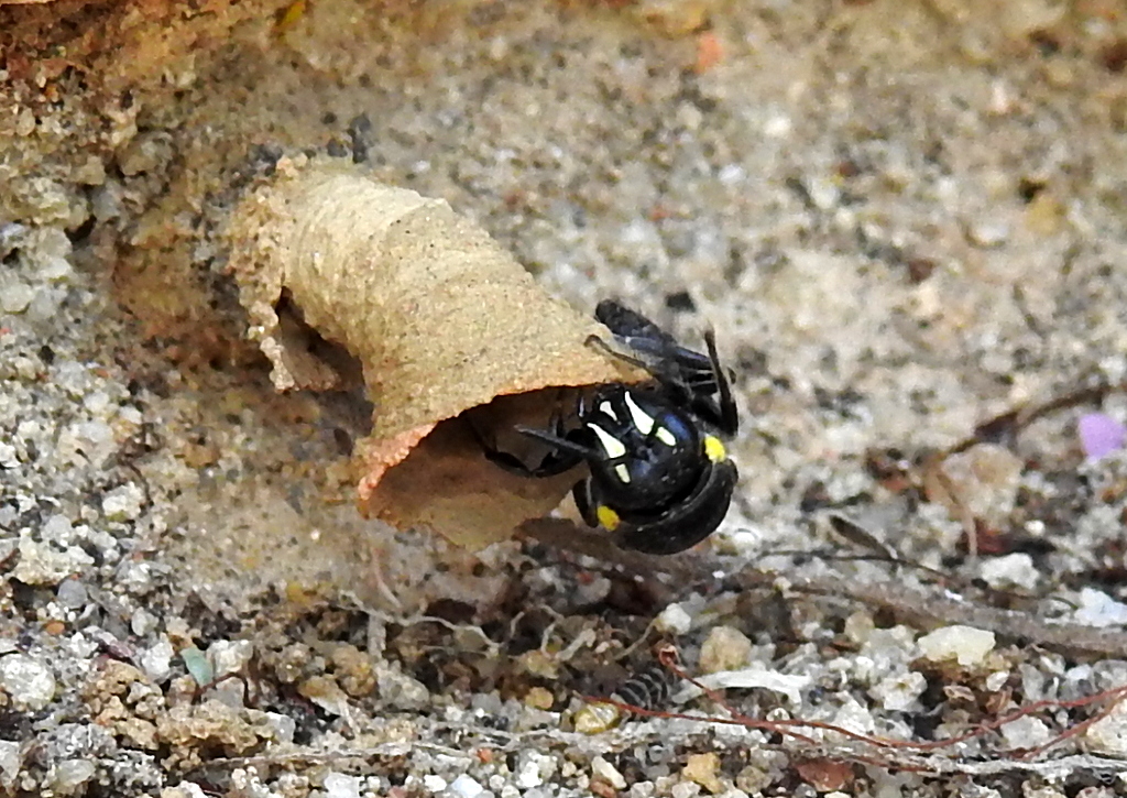 One species of bees has an easier strategy still. The Cloudy Masked Bee (Hylaeus nubilosus) finds an abandoned nest of a potter or mud dauber wasp and moves in. No construction costs, no fighting with the neighbours (or the residents).