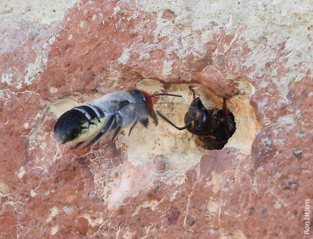 The Blue-banded Bees (Amegilla sp.) are back for the season and so are the parasitoid bees and wasps that try to lay their eggs in the BBB nests. These battles have been well documented over the years (click HERE). The number of parasitoid species are many.
