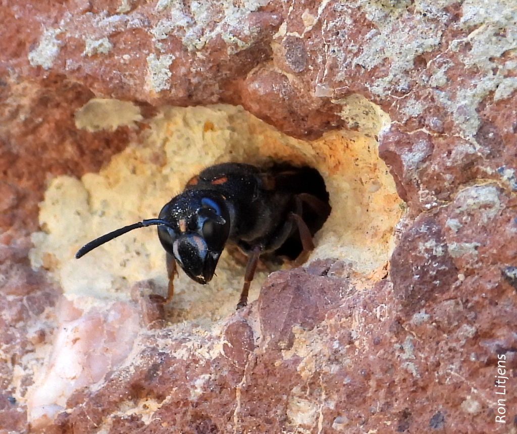 Yesterday a Mud-nesting Wasp (Paralastor sp?) was observed guarding the entrance of an old drill hole when a Leaf-cutter Bee (Megachile sp.) obviously took exception to it being there (pictured above). What ensued was a tussle in which the bee dragged the wasp out of the hole and entered the nest itself (pictured below). The unperturbed the wasp went back to nest guarding duty with the bee inside. The altercation lasted about two hours with the bee and the wasp in turn harassing each other out of this prime real estate.