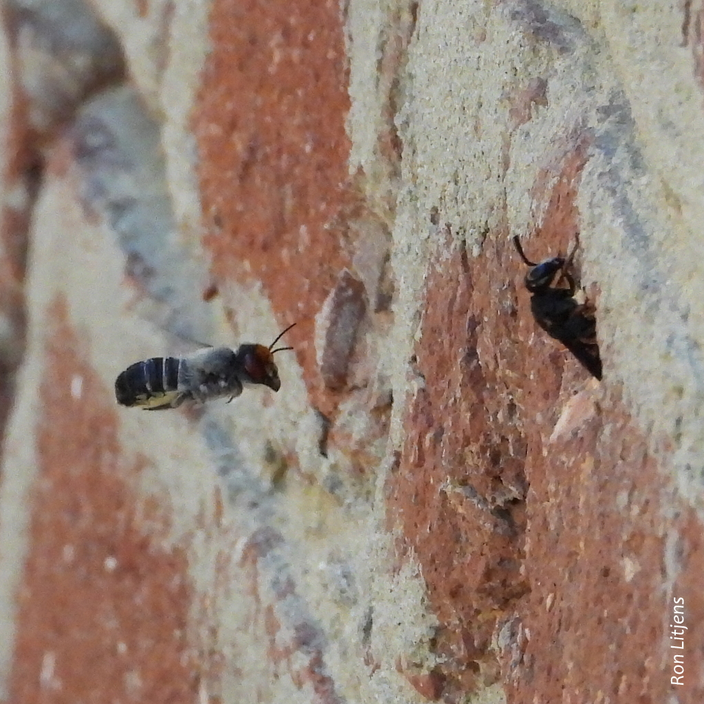 The Blue-banded Bees (Amegilla sp.) are back for the season and so are the parasitoid bees and wasps that try to lay their eggs in the BBB nests. These battles have been well documented over the years (click HERE). The number of parasitoid species are many.