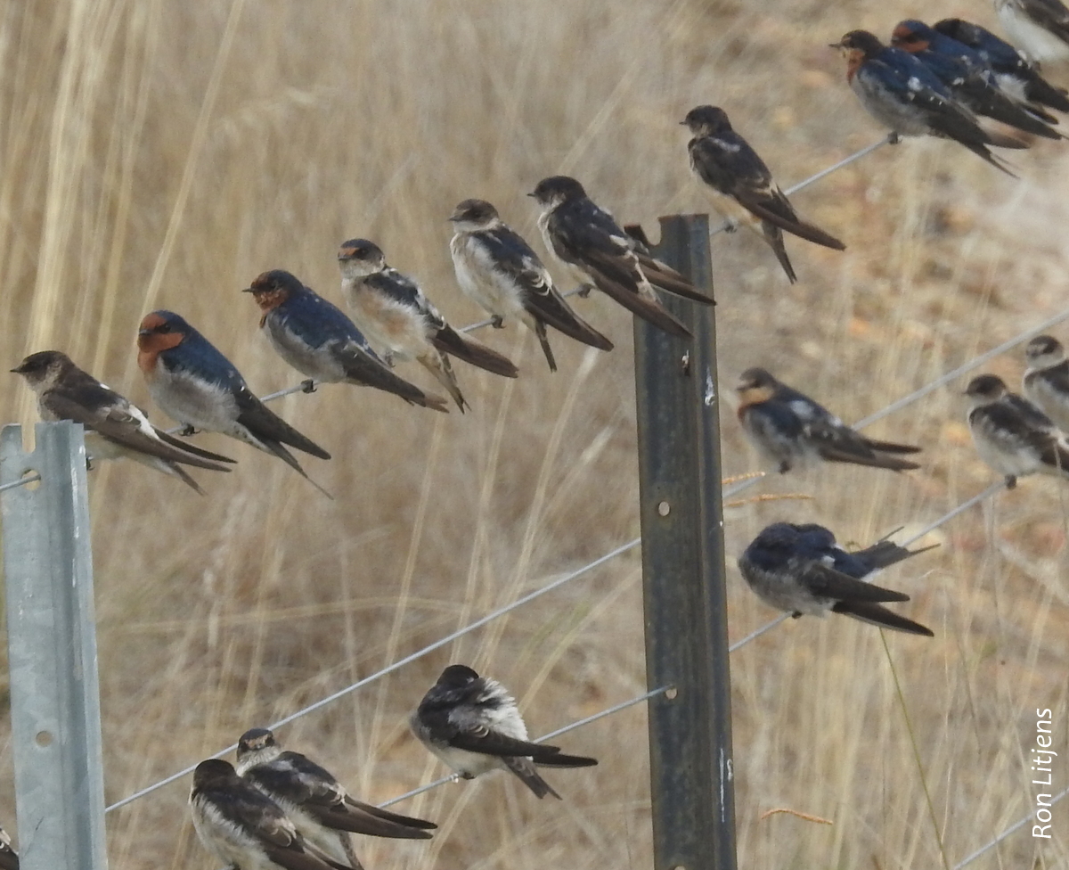 Swallows are widespread throughout Australia. Two species of swallows and two species of martins, also of the swallow family, occur in this district. Martins are distinguished from swallows by the square-shaped tail. Both swallows and martins are highly gregarious and are often seen in mixed flocks perched along fence lines (pictured below) in this case Welcome Swallows (Hirundo neoxena) and Tree Martins (Petrochelidon nigricans).