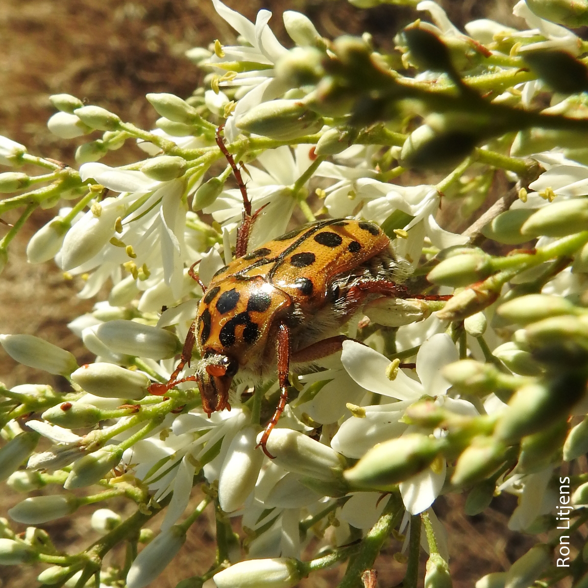 At this time of the year a number of flower chafers are active including Punctate or Spotted Flower Chafer (Neorrhina punctatum), pictured right, and the Grey-furrowed Rose Chafer (Trichaulax philipsii), pictured below left, most notable because the grey furrows are actually densely packed hairs on the wing-case.