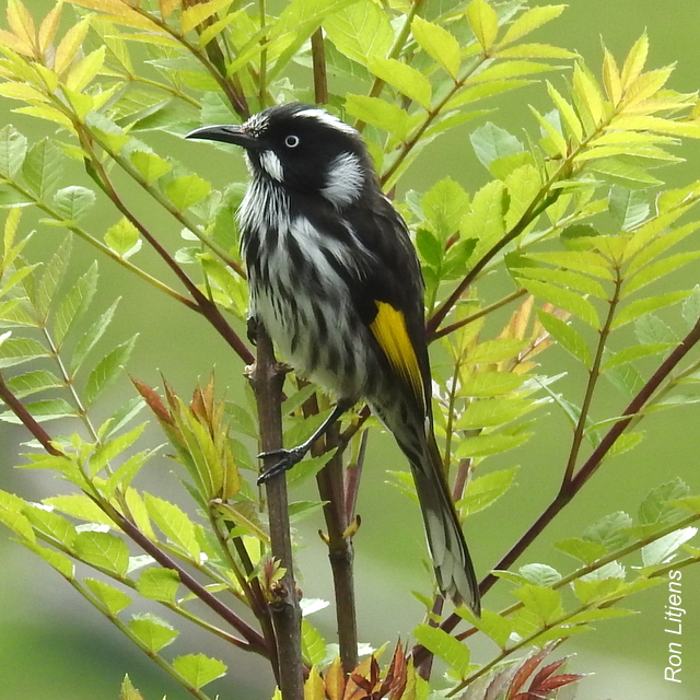 Not only is sitting still for 20 minutes a nice contemplative practice but in that time the birds seem to either not realise or they forget that you are there. This can afford an opportunity to observe them in greater detail, particularly those birds which are particularly flighty and take off as soon as you appear. In my garden one such bird is the New Holland Honeyeater (Phylidonyris novaehollandiae). Looking like a cross between a Collingwood and a Richmond supporter (in colour that is), the New Hollands are very active birds and are easily spooked. As their name suggests these honeyeaters feed on nectar and spend their time flitting between flowering bushes.