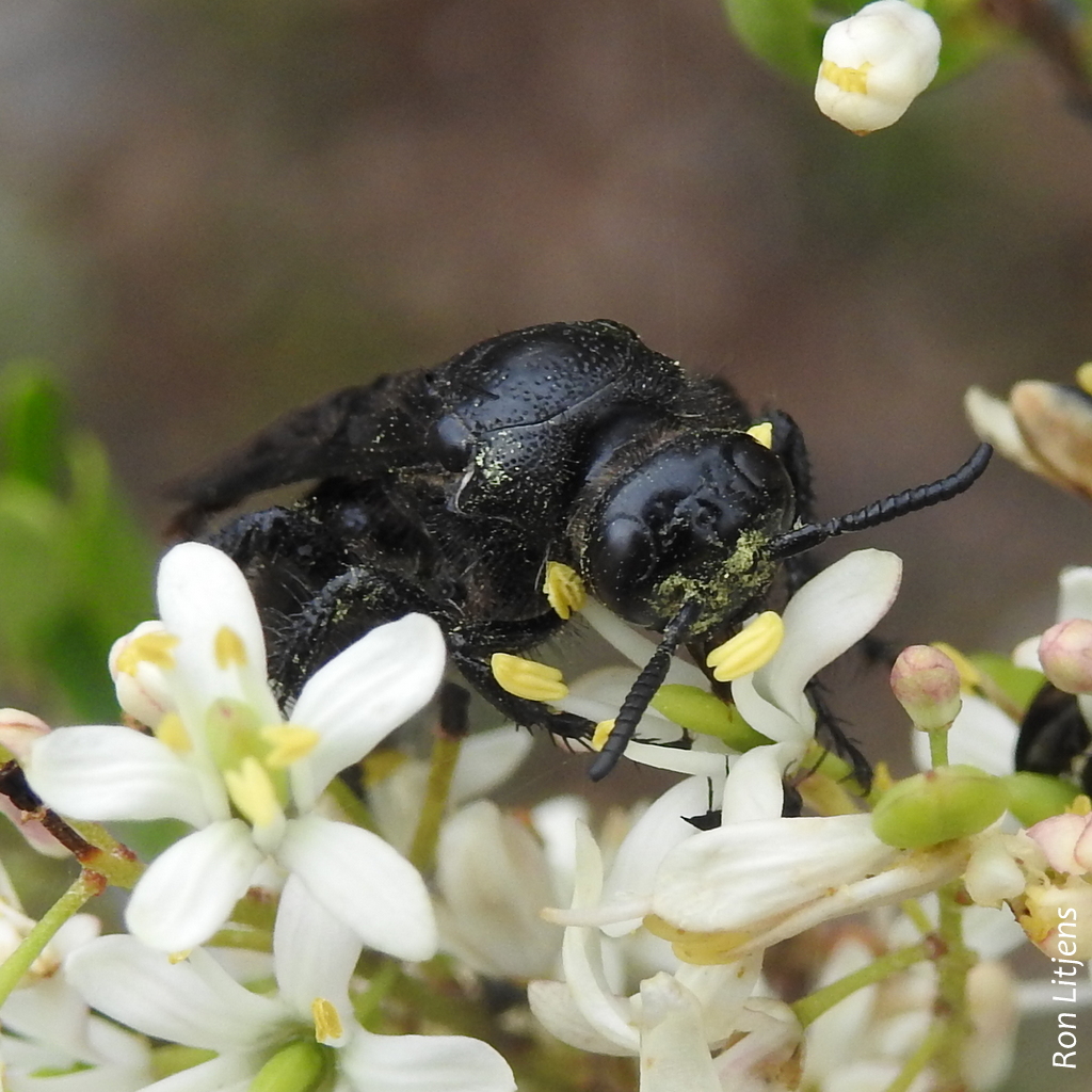 Hairy Flower Wasps come in several colours. Black Hairy Flower Wasps (Austroscolia soror) pictured right, typical fly low over piles of mulch or wood chips in the search for grubs.