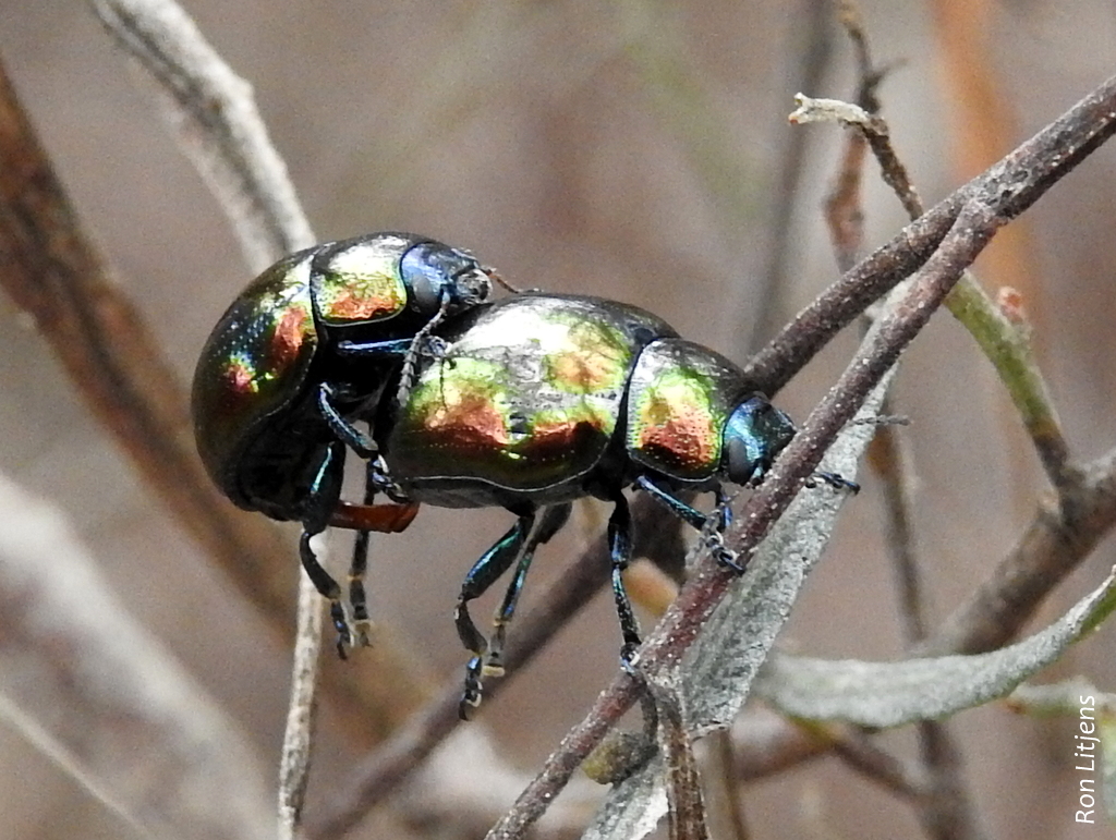 Even more spectacular in appearance are the leaf beetles of the genus Callidemum, (Callidemum hypochalceum pictured above and right). These beetles have a metallic sheen on their carapace, so much so that it was difficult to photograph without getting your reflection in the image. Their plant of choice is Dodonea (Hop-bush).