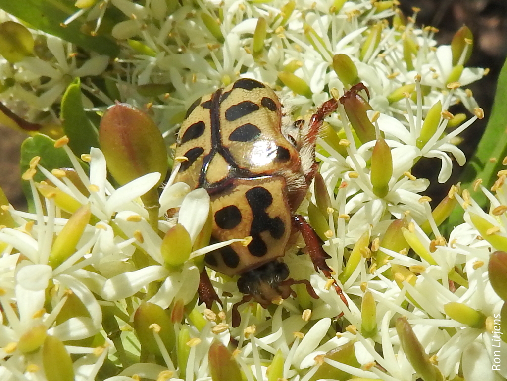 Christmas time is the time of the Scarabs – think Xmas Beetles, Fiddler Beetles and Spotted Flower Chafers (Neorrhina punctata), pictured left. I have childhood memories of there being are lots of them around at Xmas but there don’t seem so many around any more. It is also the time of the year when scarab beetle grubs, those big white grubs that live in the ground get nervous (I am anthropomorphising a bit).
