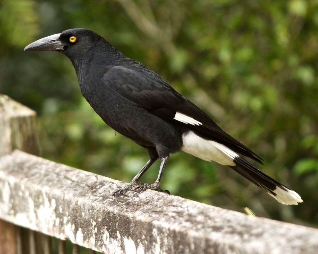 Currawongs (Streptera) come in two varieties in our district – the Pied (S. graculina), common around towns and the Grey (S. versicolor), a bird of forests and hills. The Pieds used to come to town for the Winter and spend the summer in alpine areas, but since the 1980s, observers have noticed that they now are present all-year round (though numbers are a bit smaller in the warmer months). Some people think this is responsible for a decline in small songbirds in cities and towns, as they are so effective at finding nests and robbing them.