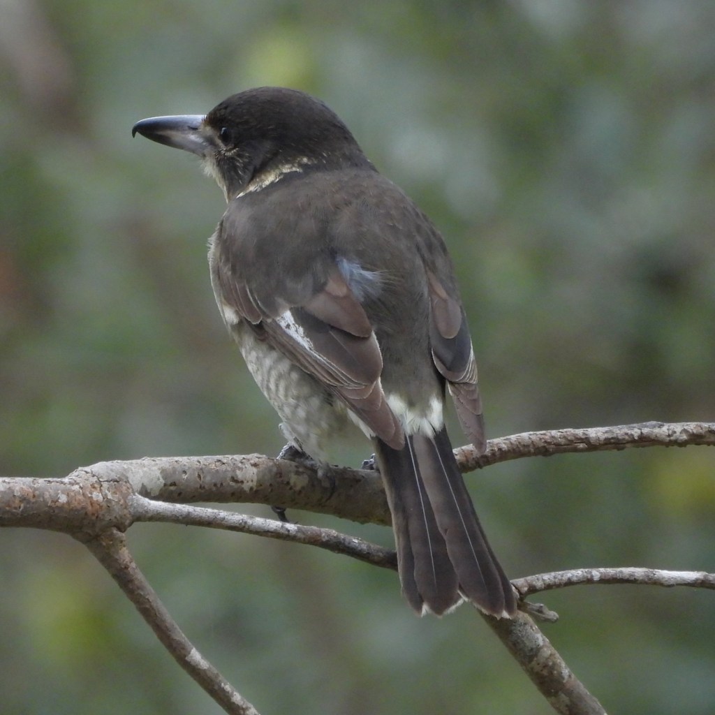 The Grey Butcherbird (Cracticus torquata) gets its name from the alleged habit of this family of birds of hanging larger prey on spikes or in forks of branches to eat at leisure. I have never witnessed this and it certainly seems to be more common in American species of Shrike (which are the same family). I asked around and one friend supplied the following photo of a butcherbird with a forlorn young Rufous Fantail strung up.