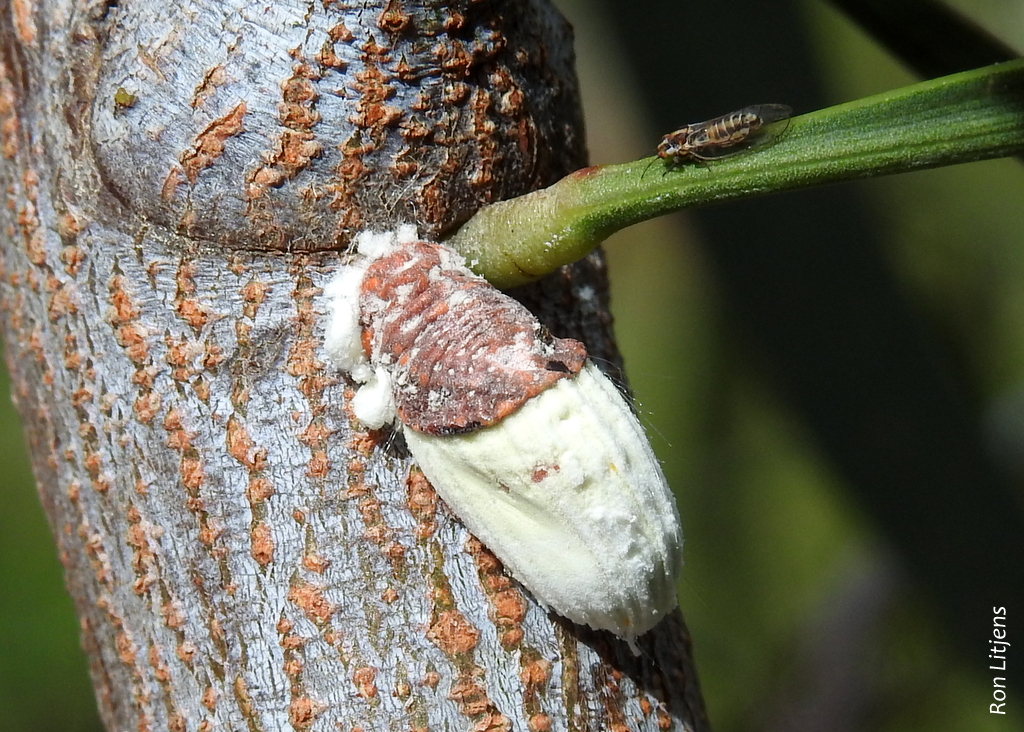 The Cottony Cushion Scale (Icerya purchasi), pictured below, is one of Australia’s more infamous exports. It is an Hemiptera i.e. a sap-sucking bug that has a liking for many Australian woody plants (particularly Pittosporum) but loves citrus plants in general. Both the adult and the nymph insects suck on sap of the leaves and woody material of the food plants. The adult, pictured, is reddish-brown in colour and crusted with waxy secretions.