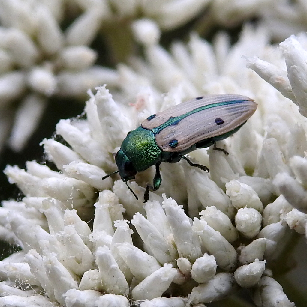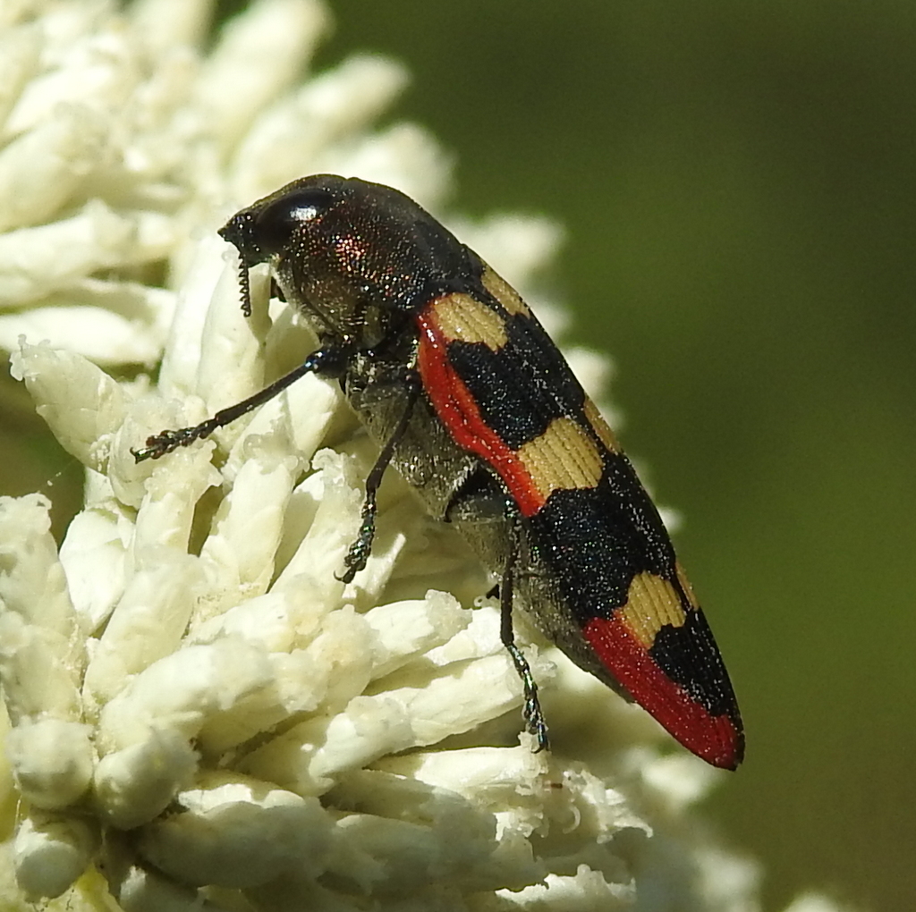 The most stunning of the visitors are the Jewel Beetles (pictured above). Jewel Beetles are a large family of beetles many of which are noted for their iridescent wing cases. There are about 1200 known species in Australia. The adults feed on nectar but the larvae are wood borers.