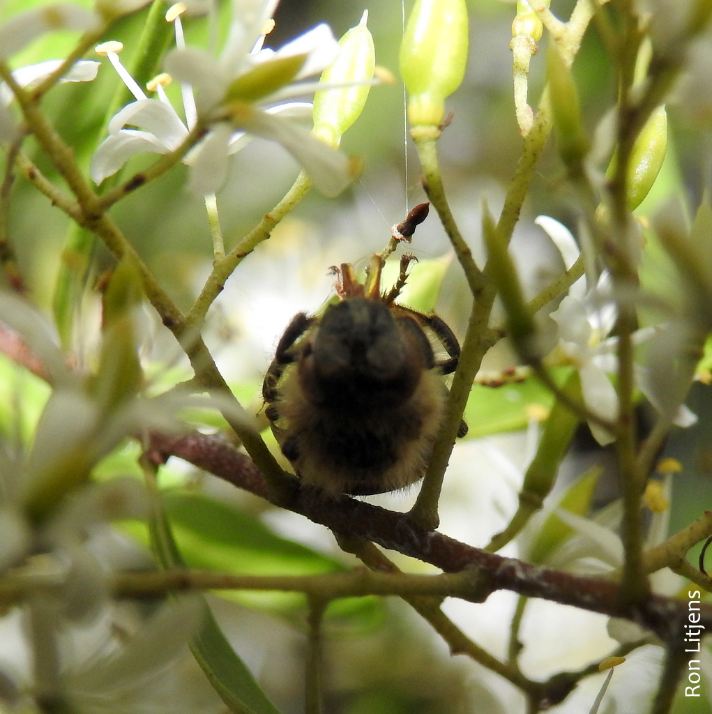Most plants are pollinated by insects so it is not usual to see Western Honey Bees (Apis mellifera) for example visiting their flowers. In some cases however the sheer number of flowers or the amount of pollen and nectar a plant produces creates an environment attracting hundreds of insects. I call these Jewel Boxes because they are attract a diversity of animals. Common Cassinia (Cassinia aculeata) is one of these. At the moment it is covered with all manner of flies, moths, beetles and spiders. Not all these invertebrates are pollinators. To be true pollinators they would need to have hair or combs on the legs with which to first trap pollen and then transport it to the next flower. A lot of these critters are there just to feed.